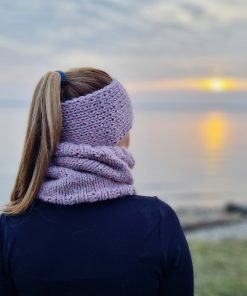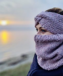 Pletený set čelenky a nákrčníka z prírodnej priadze zloženej z vlny alpaky a ovčej vlny.